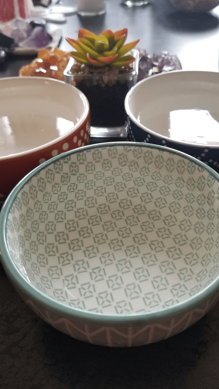 I take small, decorative bowls (you can use anything from vintage thrifted dishes to handmade ceramics — whatever feels good to your aesthetic), and I fill them with clean water, adding a few drops of essential oil. That’s it! I place these bowls around different areas of my home, and they do so much with so little.